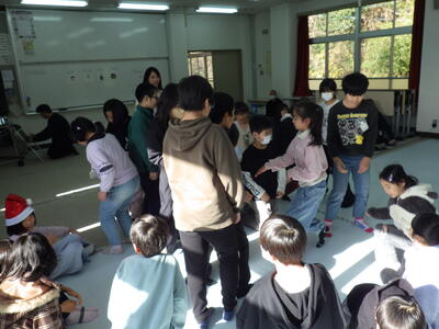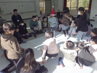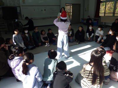 中間休みに、英語専科の先生とALTの先生が全校児童を対象に楽しいクリスマスパーティーを開催してくださいました。ALTの先生はフィリピン出身ということで、フィリピンのクリスマス文化について紹介してくれました。日本との違いや、フィリピンならではの過ごし方に子どもたちは興味津々!その後は、みんなで「クリスマスバスケット(フルーツバスケット)」を楽しみました。笑顔と笑い声があふれる、最高のクリスマス授業になりました。