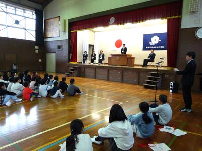 児童集会を行い、2月の取組の反省、児童会本部役員の引継式、そして賞状伝達式を実施しました。まず、2月の取組反省では、1か月間のがんばりや、次につなげたい課題が発表されました。自分たちの学校生活をよりよくしていこうとする、由良川っ子の前向きな姿勢が感じられました。