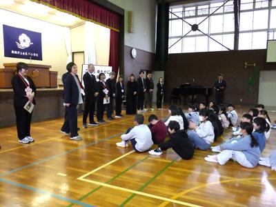 離任式を行いました。これまで本校の教育活動を支え、子どもたち一人一人に温かく寄り添ってくださった先生方とのお別れの日です。式では、離任される先生方から、子どもたちへの最後のメッセージが贈られました。思い出深いエピソードや、これからの成長を願う言葉に、子どもたちは真剣な表情で耳を傾けていました。代表児童によるお別れの言葉とメッセージカード贈呈では、「先生から教えてもらったことを忘れずに、これからもがんばります」という力強い言葉が伝えられ、会場は温かな雰囲気に包まれました。先生方から受け取った思いを胸に、新しい学年、新しい一歩へと進んでいきます。離任される先生方の新天地でのご活躍とご健康を、教職員・児童一同、心よりお祈りしています。