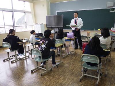 修了式のあとには、生徒指導担当の先生より、自転車の正しい乗り方や交通ルールについてのお話がありました。特に、道路交通法の改正内容にもふれ、安全に気をつけて春休みを過ごすよう呼びかけが行われました。