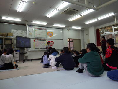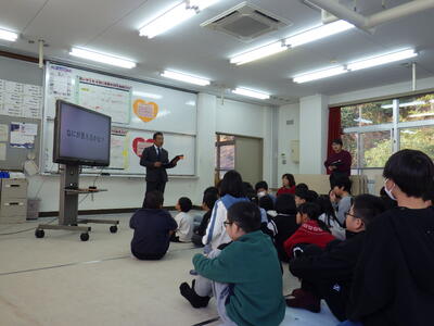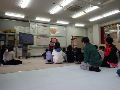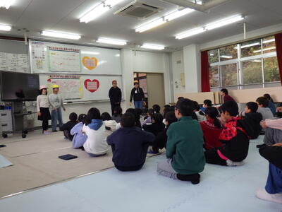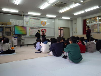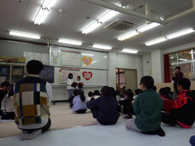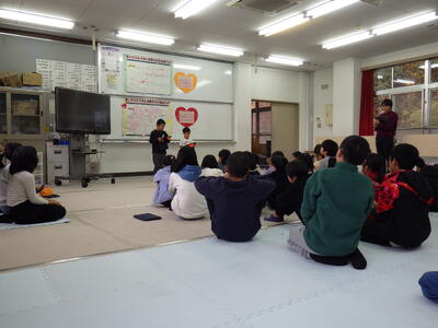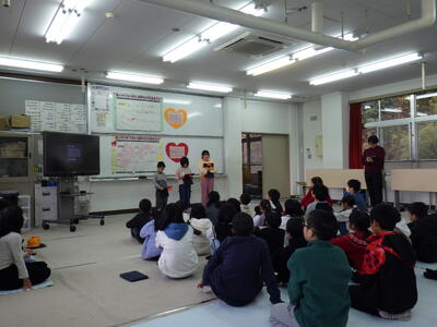 「人権学習まとめの集会」を行いました。この集会では、各学級からこれまで取り組んできた人権学習の成果を発表しました。友達のよさを見つける活動や、思いやりの言葉を広げる取組など、学級ごとに工夫した内容が紹介され、みんな真剣に聞いていました。続いて、児童会本部役員から11月に行った人権に関する取組の報告がありました。全校で協力して「やさしい言葉を広げよう週間」に取り組んだことや、廊下に掲示したメッセージカードの紹介があり、児童会のリーダーとしての思いが伝わる発表でした。