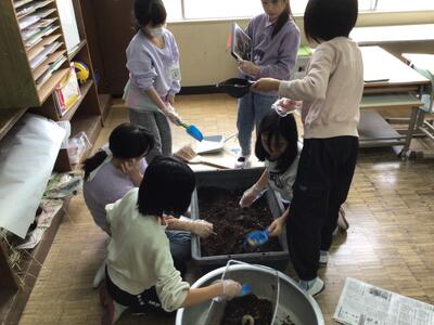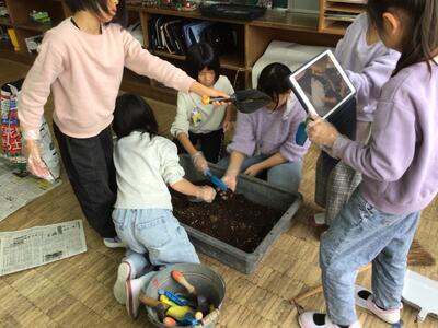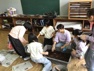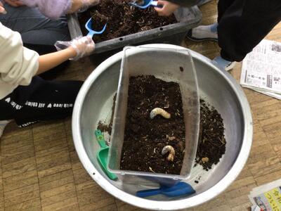 3年生の理科では、こん虫の観察をしています。今日は、カブトムシの幼虫の土を入れ替える活動を行いました。ケースの中から大きな幼虫が姿を現すと、子どもたちからは「きゃー!」と驚きの声があがりました。最初は少しこわごわしていた子も、勇気を出して手で土を入れ替えます。「フンがいっぱいある」「入れていた木が食べられてる」などいろいろな発見がありました。