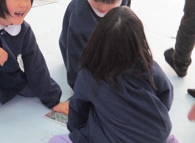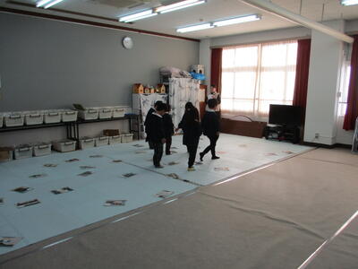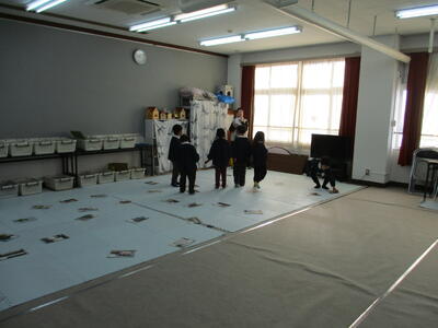 3学期のつながり活動では、由良川小学校の1・2年生と、保育園の年長児のみなさんが一緒に学校探検を行い、その後、協力して「学校かるた」を作りました。今日の活動では、完成したカルタを使ってみんなで楽しく遊び、教室は大盛り上がり。「学校のことをよく知っている1・2年生が有利かな?」と思っていましたが、何度も由良川小学校に来ている年長児の皆さんも学校のことにとても詳しく、負けず劣らず活躍していました。