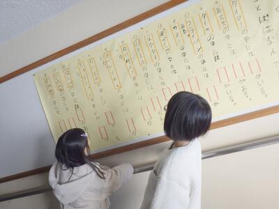 2/19 1年生の掲示板 投稿: 学校管理者 (15:15) カテゴリー: 全校 1年生掲示板には、彼らの豊かな表現が並び、廊下を通るたびに子どもたちの視線を引きつけています。通りすがりの上級生たちは、作品の前で足を止め、「これ、なんの言葉が入るんだろう?」「わかった! たぶんこれや!」と、友達同士で答えを考えながら歩いています。 -