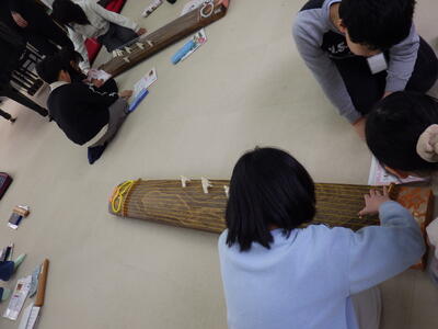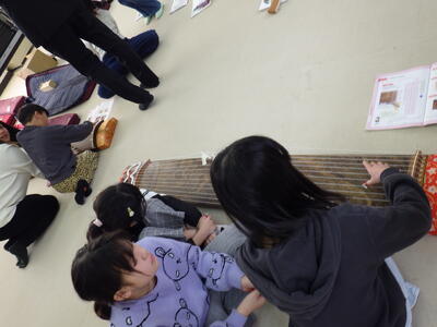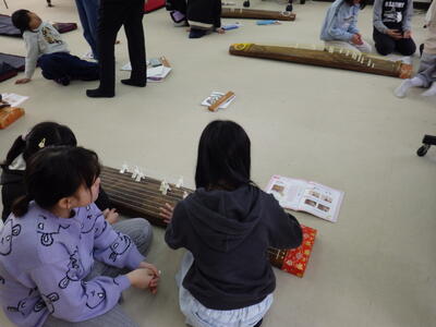 3/4 音楽3・4年 投稿: 学校管理者 (03/04) カテゴリー: 中学年 3・4年生の音楽の学習で、加佐中学校からお琴をお借りして演奏体験をしました。子どもたちは初めて触れる伝統楽器にドキドキしながらも、指の動かし方や音の出し方を一つ一つ学び、教室いっぱいに美しい音色が響きました。楽器に直接触れることで、日本の伝統音楽の魅力を実感することができました。 -