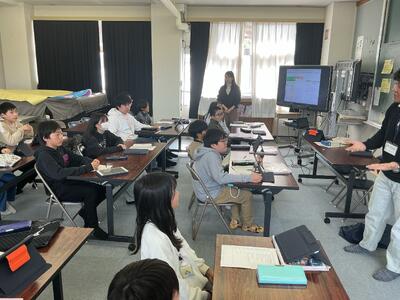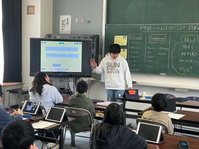岡田小学校6年生と本校6年生が合同で英語学習を行いました。中学校進学を控え、同じ学年同士で交流しながら学べる貴重な機会となりました。今回の学習テーマは 「I want to ~.」の表現を使って、自分の願いやしたいことを伝えよう」 です。はじめに、それぞれのクラスで練習してきた表現を復習し、ペアやグループになって自己紹介や「I want to …」を使った会話に挑戦しました。活動が進むにつれて笑顔が増え、どのグループからも「もう一回話したい!」「次は私が言ってみる!」と、積極的な声が聞こえてきました。6年生同士が互いに励まし合いながら英語で交流する姿から、もうすぐ中学生になる自覚と成長が感じられました。