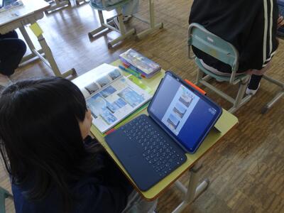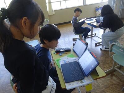 4/16 雲の様子と天気の変化 投稿: 学校管理者 (18:33) カテゴリー: 5年 5年生の理科では、雲の様子と天気の変化にはどのような関係があるのかという学習課題から、予想を立て、朝、正午、14時の3回、定点観測しました。 タブレット端末で撮影したそれぞれの写真を並べて、雲の色や形、動いた方位に着目して気づいたことをまとめました。 また、時間の変化による雲の様子や天気の変化について、自分の考えを交流しました。 交流を通して、友達の気づきから、雲の流れと土地の様子との関連について考えを深めることができました。 -