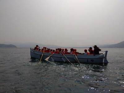 14:00 カッター訓練をします。みんなで息を合わせて櫂(かい)を漕ぎます。